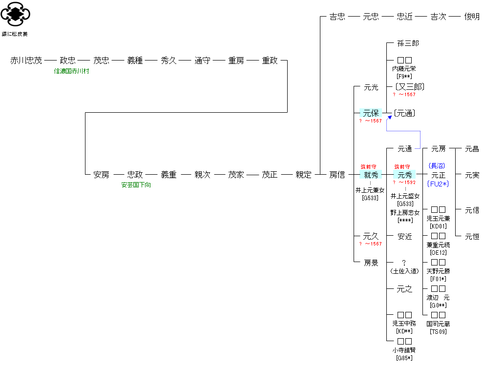 | H482:小早川景平 | 平 高望 ― 平 良文 ― 平 頼尊 ― 小早川景平 ― 赤川忠茂 | H485:赤川忠茂 | ● |