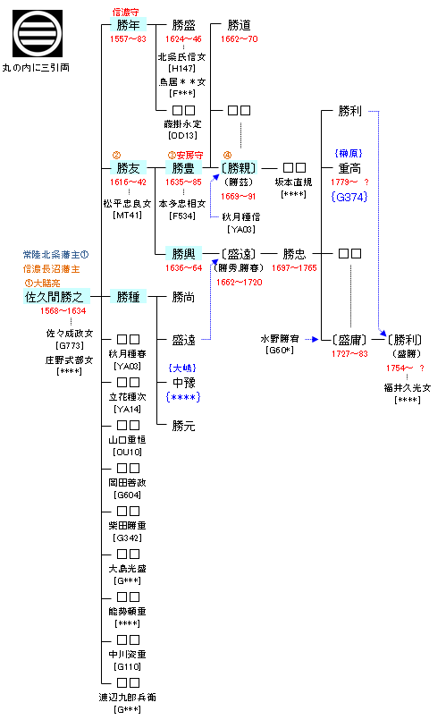 | H505:佐久間盛重 | 平 高望 ― 平 将常 ― 平 忠通 ― 三浦義明 ― 佐久間家村 ― 佐久間盛重 ― 佐久間勝之 | H506:佐久間勝之 | ● |