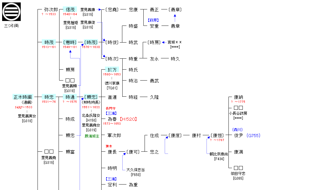 | H518:三浦盛時 | 平 高望 ― 平 将常 ― 平 忠通 ― 三浦義明 ― 佐原義連 ― 佐原盛連 ― 三浦盛時 ― 正木時綱 | H519:正木時綱 |