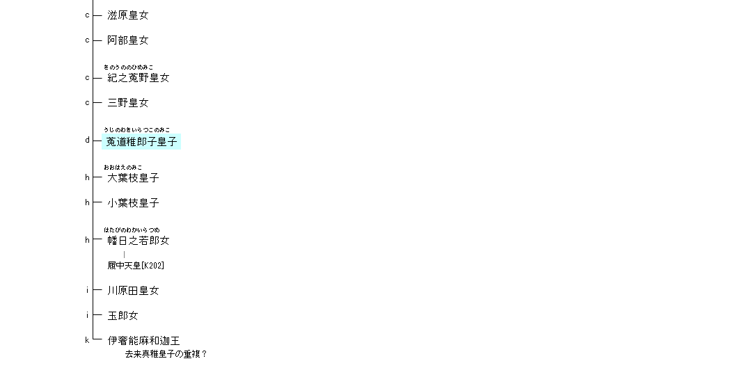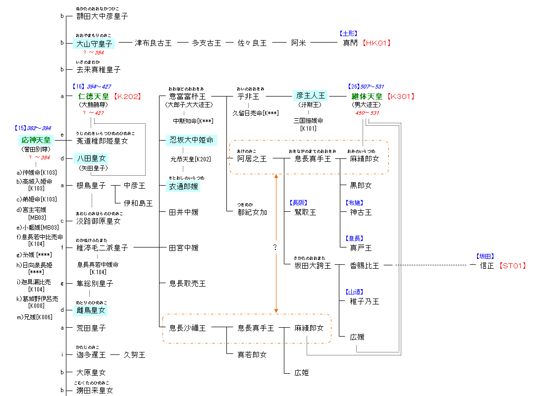 | K104:日本武尊 | 日本武尊 ―(仲哀天皇)― 応神天皇 | K201:応神天皇 |