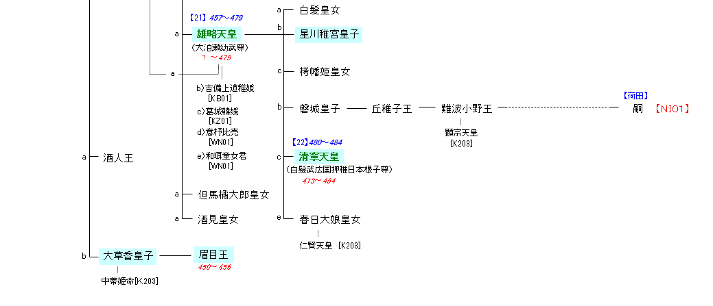 御名の「白髪皇子」の通り、アルビノで生来白髪であったため、父帝の雄略天皇は霊異を感じて皇太子としたという。 |