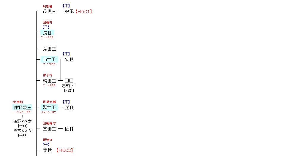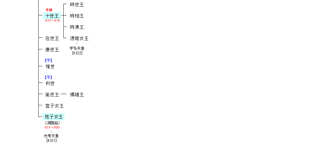 | K312:桓武天皇 | 継体天皇 ― 欽明天皇 ― 敏達天皇 ― 押坂彦人大兄皇子 ― 天智天皇 ― 桓武天皇 ― 仲野親王 | K315:仲野親王 |