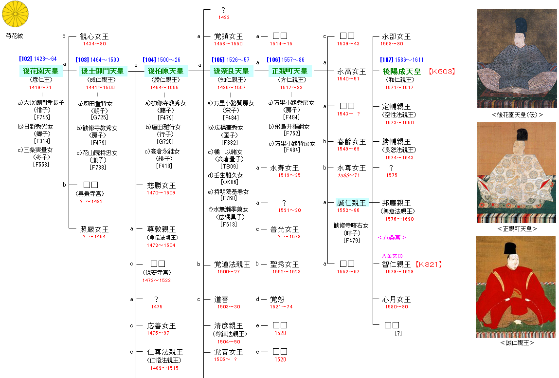 | K501:光厳天皇 | 後鳥羽天皇 ― 土御門天皇 ― 後草深天皇 ― 光厳天皇 ― 後花園天皇 | K602:後花園天皇 |