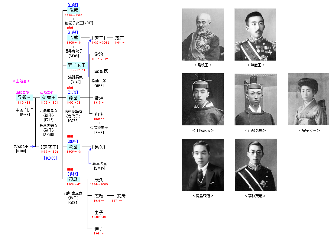 | K803:伏見宮邦家親王 | (栄仁親王)― 貞常親王 ― 貞清親王 ― 邦家親王 ― 晃親王 | K804:山階宮晃親王 | ● |