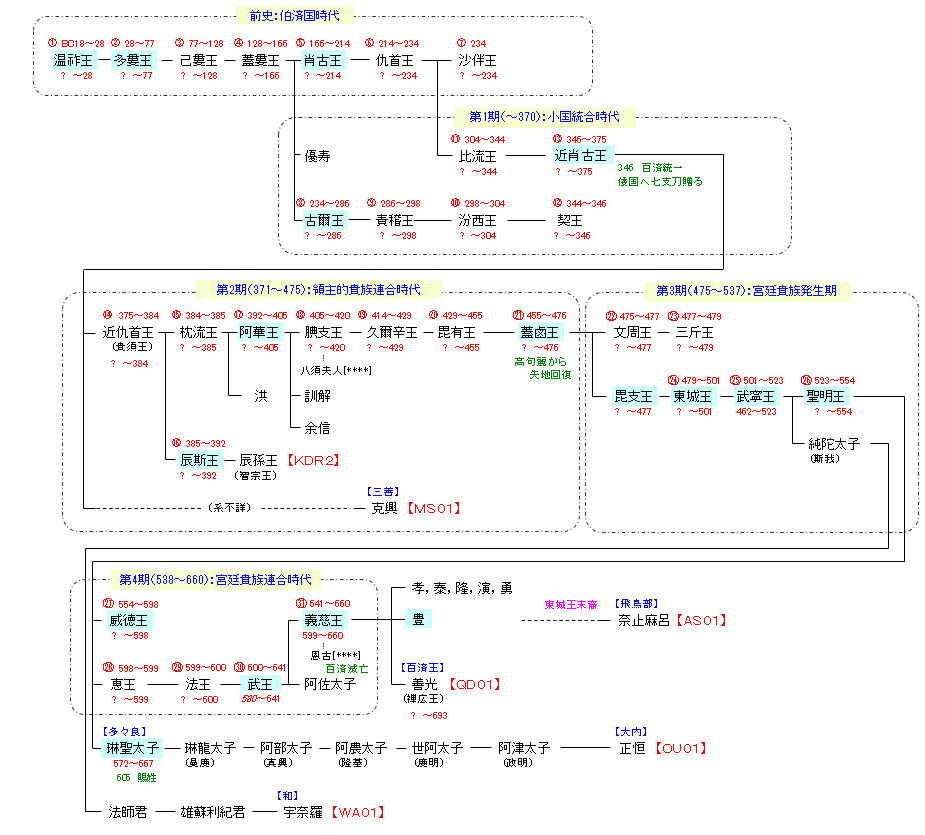 234年に第6代の仇首王が死去した際に、その長子の沙伴王がいったん王位についたが、幼少であったため政務を執ることができず、肖古王の王弟の古尓王が王位を継いだ。 |