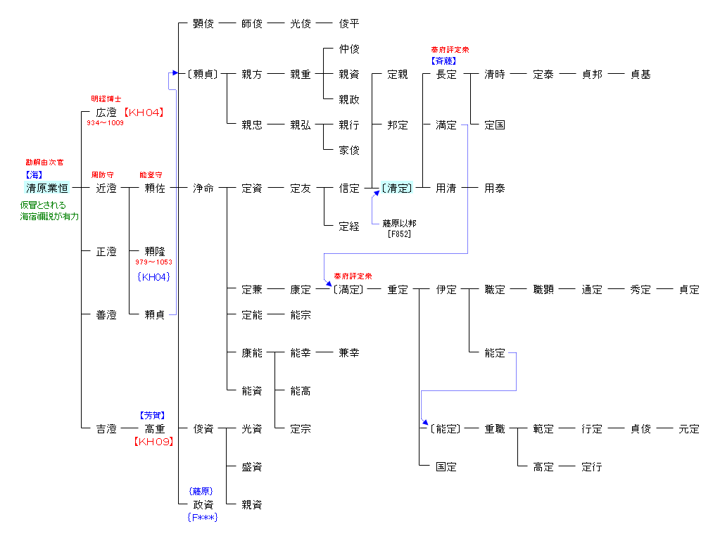 | 江戸時代後期の『群書類従』版「清原氏系図」では、清原氏の有雄流の系図につなげられているが、20世紀以降、日本史や氏族研究を専門とする研究者からは基本的に支持されていない。天武天皇の養育係であったともいわれる凡海麁鎌の7世孫である海信恒の子ともいわれる。凡海麁鎌の一族は天武天皇の壬生(養育者)だったとみえ、その一方で皇別氏族の清原氏がしばしば天武天皇の子孫とされたことから、その縁を頼りにして、凡海氏(大海氏)の末裔は天武後裔を自称し、清原氏を称すようになったのではないか、とする。房則の養子になったかは不明だが、『群書類従系図』では、寛弘元(1004)年に海宿禰を改め清原真人となっている。正五位下・左京大夫、勘解由次官。この系が貴族清原氏の本流(広澄流)となっていく。 |