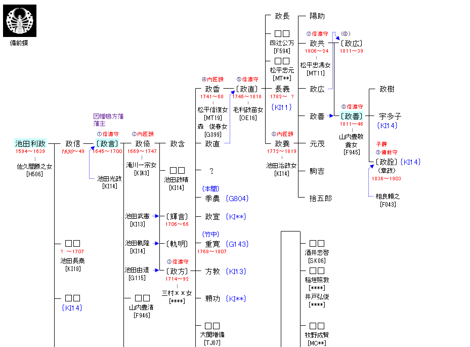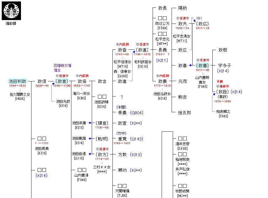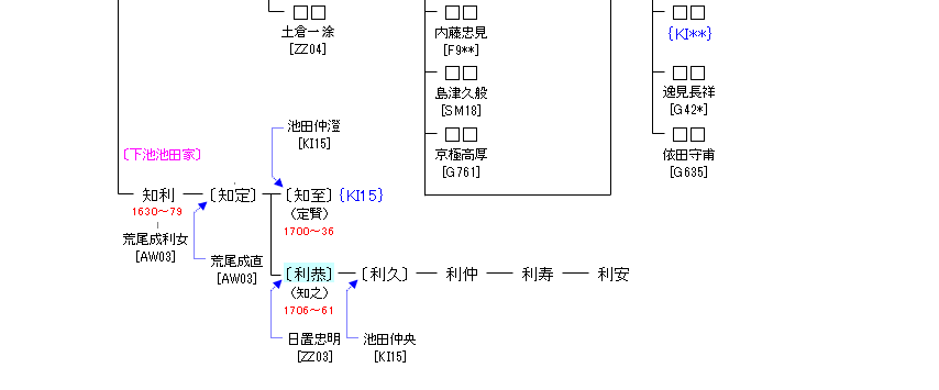 | KI13:池田輝政 | 池田維実 ― 池田奉永 ― 池田奉忠 ― 池田教正 ― 池田信輝 ― 池田輝政 ― 池田利政 | KI17:池田利政 | ● |