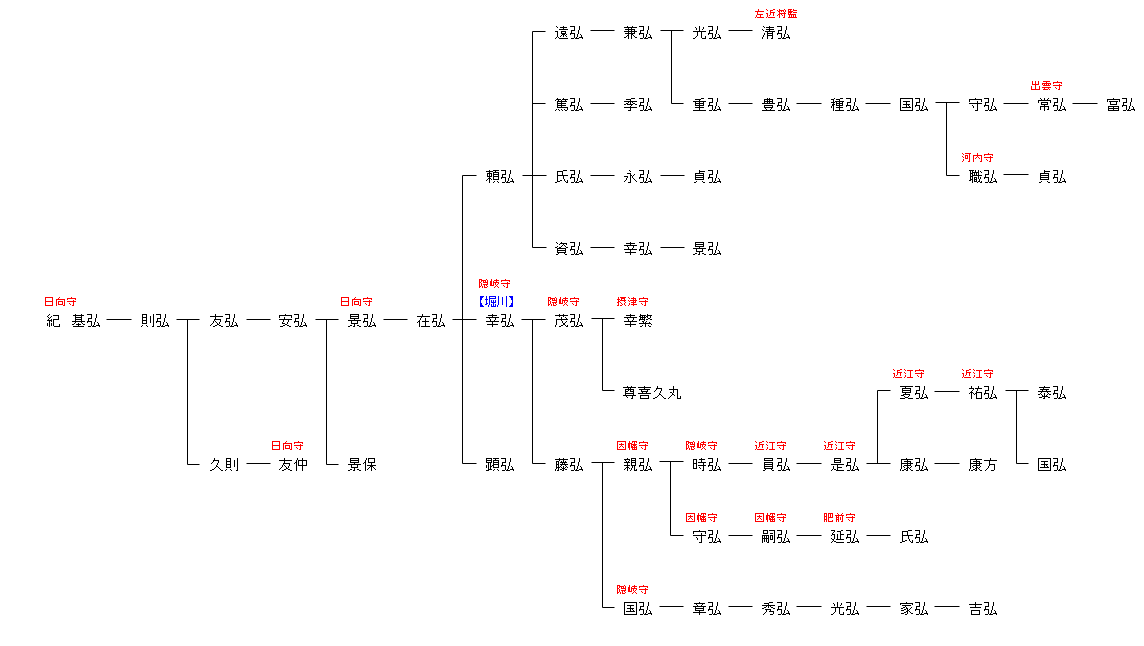 紀 角 ― 紀 大人 ― 紀 麻呂 ― 紀 長谷雄 ― 紀 淑信 ― 紀 基弘