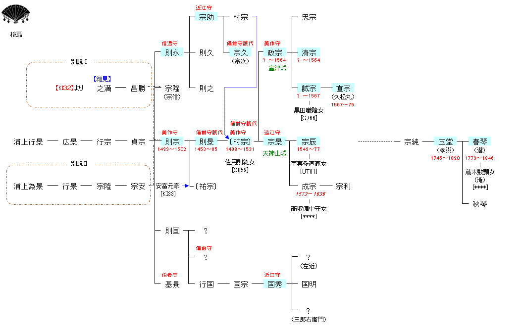 | KI33:堀田俊重 | 紀 角 ― 紀 大人 ― 紀 麻呂 ― 紀 長谷雄 ― 紀 淑光 ― 堀田俊重 ― 浦上行景 | KI37:浦上行景 | ● |