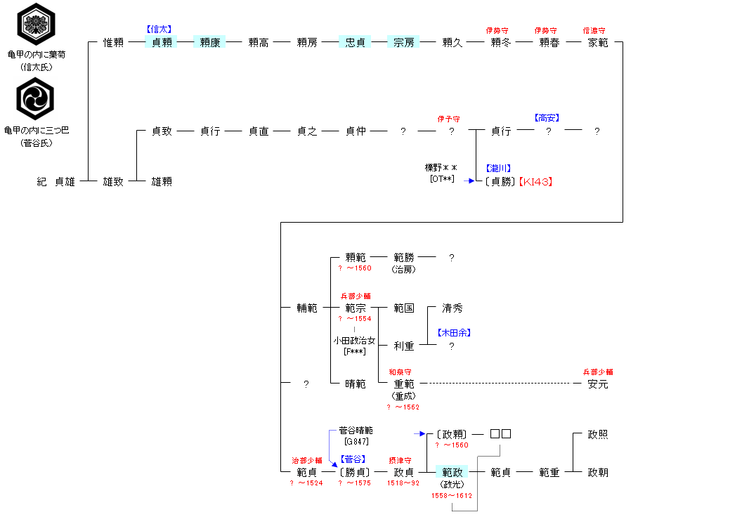 KI06:紀 長谷雄  紀 角 ― 紀 大人 ― 紀 麻呂 ― 紀 長谷雄 ― 紀 貞雄 KI42:紀 貞雄