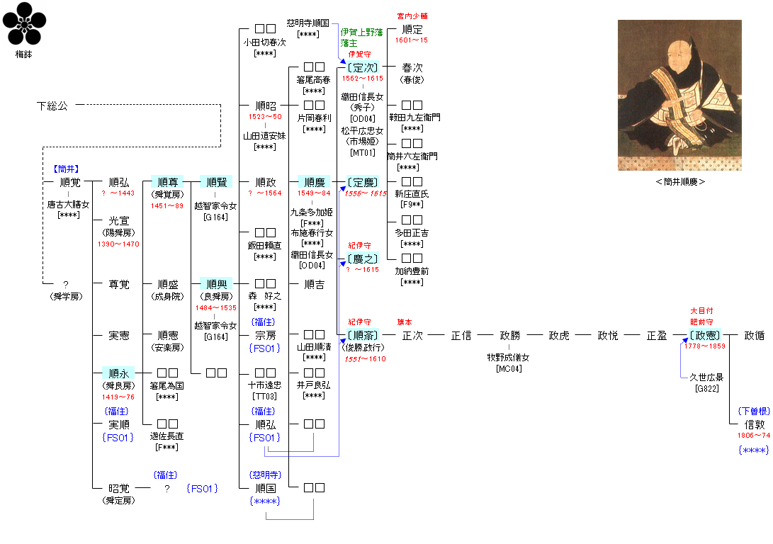 延徳元年(1488年)から9代将軍・足利義尚の命で上京していた父・筒井順尊が翌年客死したため、順賢が家督を継ぐが、幼少のため叔父・成身院順盛が後見人となったようである。 |