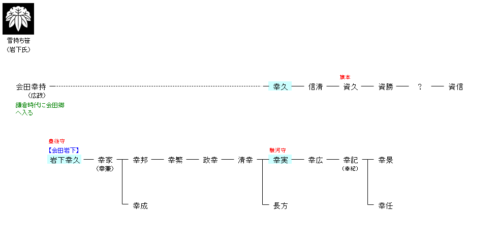 | NH03:海野広道 | 楢原久等耳 ― 滋野家訳 ― 海野広道 ― 会田幸持/岩下幸久 | NH07:会田幸持/岩下幸久 | ● |