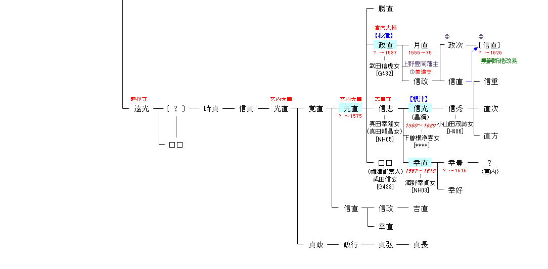 根津昌綱(根津信光)は、当時、叔父であり、当主であった根津松鴎軒常安の嫡子・根津月直が長篠の戦いにおいて討死をしたため、家督を継いだ。本来家督を継ぐべきは、昌綱の父である根津志摩守信忠であったが、一族の真田幸隆の娘を妻に迎えたものの、元来病弱で、妻の兄弟である真田昌幸に招かれ、岩櫃城下に根津屋敷「志摩小屋」を与えられ、潜竜斎を名乗って出家の身となったため、息子である昌綱が家督を継ぐことになった。 |