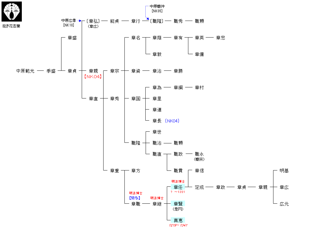 | NK02:中原致時 | 磯城黒速 ― 十市磐古 ― 中原有象 ― 中原致時 ― 中原範光 | NK03:中原範光 |