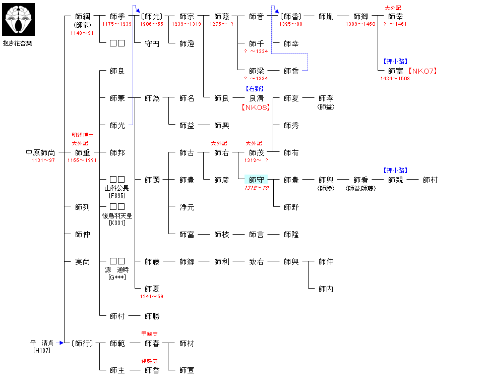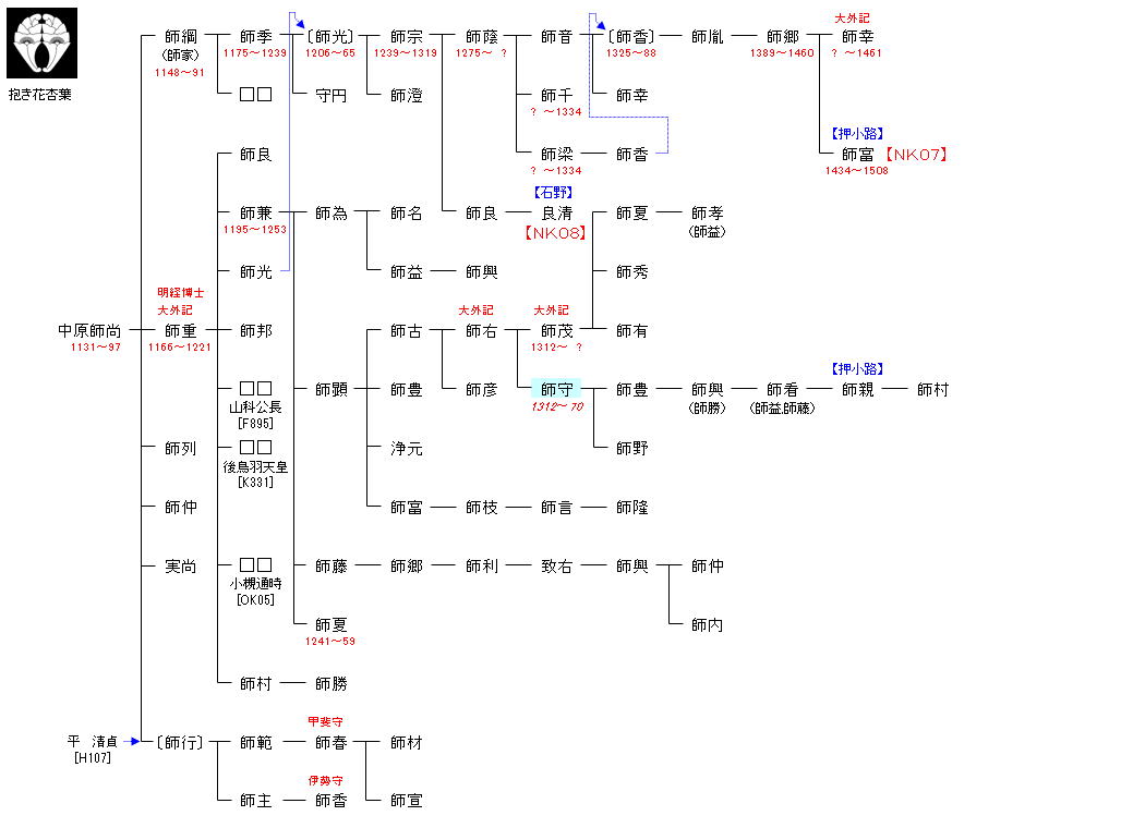 | NK05:中原師平 | 磯城黒速 ― 十市磐古 ― 中原有象 ― 中原致時 ― 中原師平 ― 中原師尚 | NK06:中原師尚 |