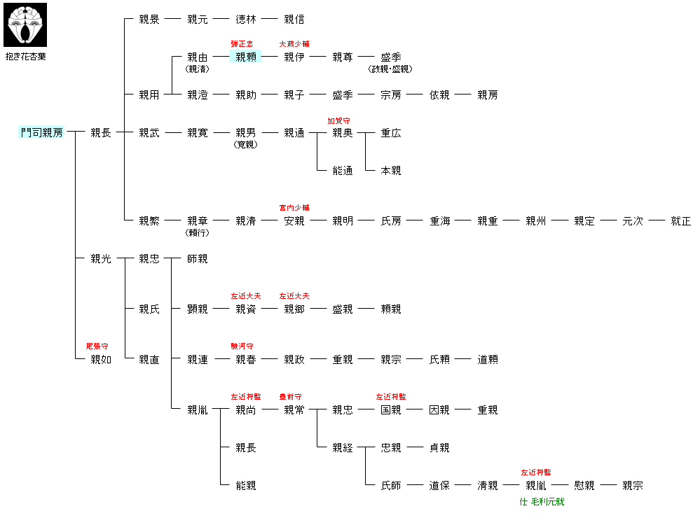 | NK10:中原貞親 | 磯城黒速 ― 十市磐古 ― 中原有象 ― 中原致時 ― 中原貞親 ― 門司親房 | NK12:門司親房 | ● |