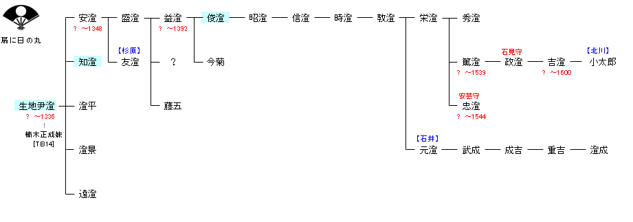 尹澄の代に元弘の争乱が起こった。尹澄は河内の楠木正成の妹を娶っていた関係から、子の安澄とともに正成に属して千早赤坂城に籠って幕府軍と戦った。隣接する隅田庄の隅田一族は幕府方として活動しており、尹澄らは隅田氏との抗争を続けた。やがて、幕府が滅亡して後醍醐天皇の親政による建武の新政が開始された。しかし、新政は足利尊氏の謀叛によって崩壊、南北朝の対立時代を迎えると尹澄・安澄父子は楠木正成とともに南朝方として行動した。 |