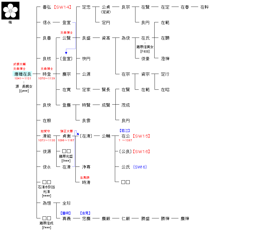 | SW03:菅原道真 | 土師身臣 ― 菅原古人 ― 菅原道真 ― 唐橋在良 | SW13:唐橋在良 |