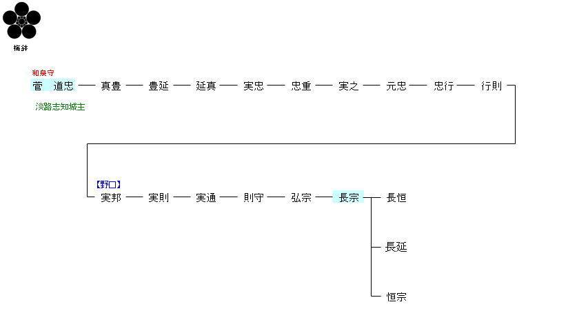 | 鎌倉時代初期の豪族で志知城を築いた。菅氏は淡路国三原郡野口村を拠点としていたといわれ、その後、菅氏あるいは野口氏を称している。 |