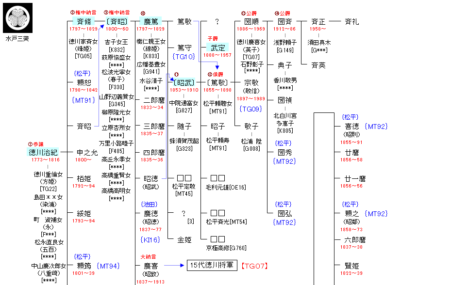 | TG31:徳川頼房 | 松平親氏 ― 徳川家康 ― 徳川頼房 ― 徳川治紀 | TG32:徳川治紀 |
