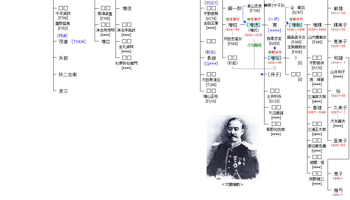 | TJ02:多治武綱 | 継体天皇 ―(宣化天皇)― 多治比 嶋 ― 丹治武綱 ― 大関高清 | TJ07:大関高清 | ● |