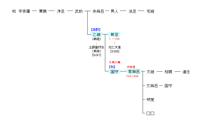 | 生前の位階・官職は不明。光仁天皇即位後、宝亀年間(770~781年)に高野朝臣と改姓(『続日本紀』に生前の記録がなく、没後の賜姓とも考えられる)。妻の土師真妹は土師氏であり、桓武天皇即位後、延暦9年(790年)に大枝朝臣と改姓(没後の賜姓である)。延暦8年までにどちらも死去し、ともに正一位が追贈された。 |