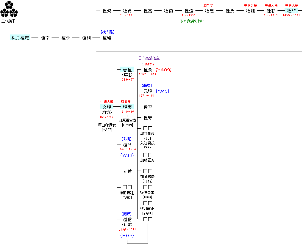 | YA07:原田種直 | 東漢 掬 ― 東漢爾波伎 ― 大蔵広隅 ― 大蔵種資 ― 原田種直 ― 秋月種雄 | YA08:秋月種雄 |