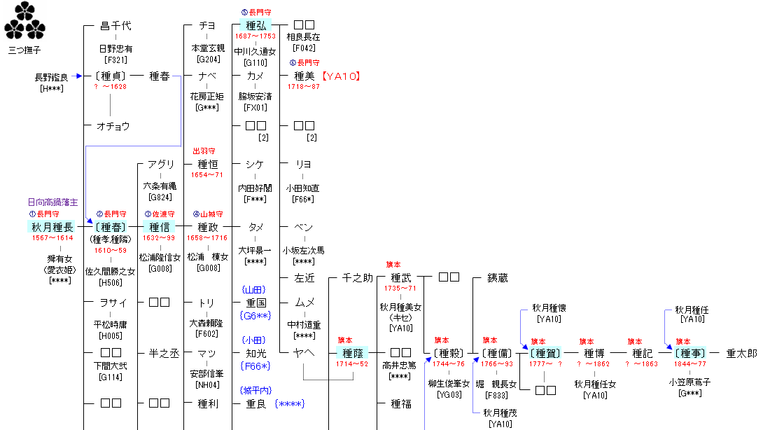 | YA08:秋月種雄 | 東漢 掬 ― 東漢爾波伎 ― 大蔵広隅 ― 大蔵種資 ― 原田種直 ― 秋月種雄 ― 秋月種長 | YA09:秋月種長 |