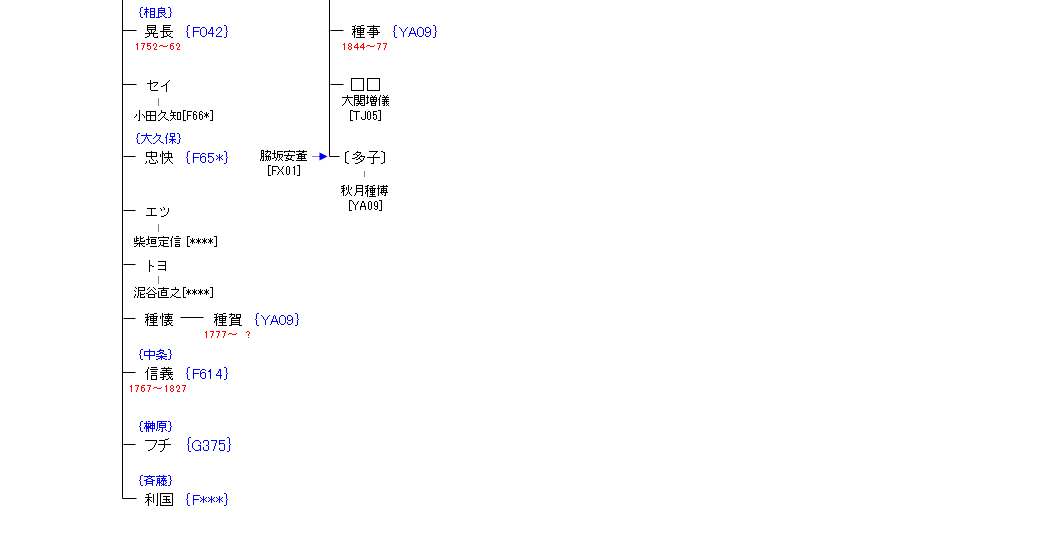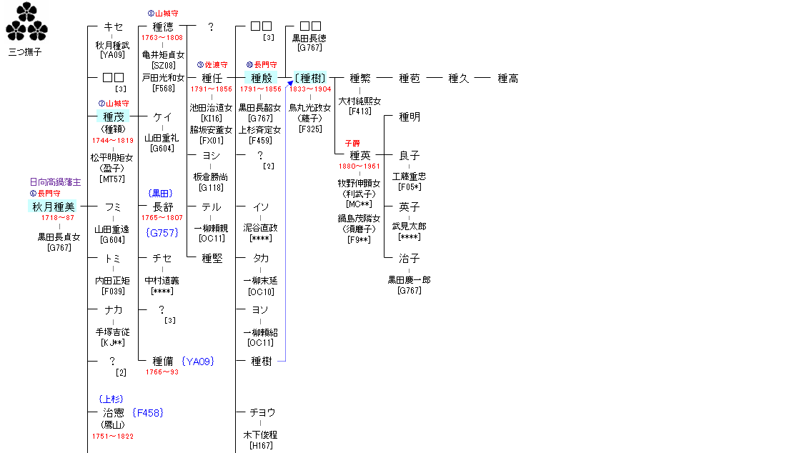 | YA09:秋月種長 | 東漢 掬 ― 東漢爾波伎 ― 大蔵広隅 ― 大蔵種資 ― 原田種直 ― 秋月種雄 ― 秋月種長 ― 秋月種美 | YA10:秋月種美 | ● |