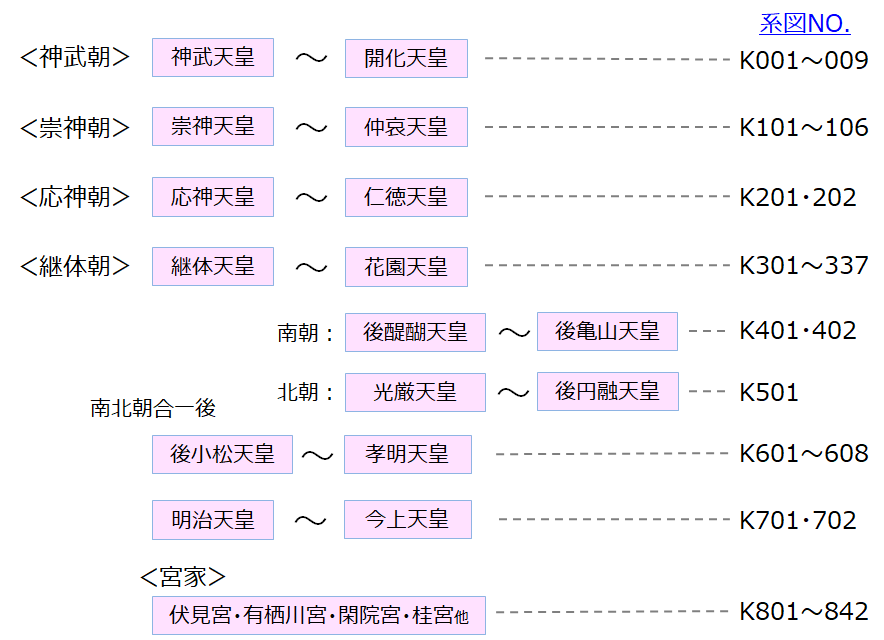 | 継体朝 | K321 | 光孝天皇 | 源〔G711〕〔G712〕〔G714〕〔G716〕・平〔H901〕〔H902〕〔H903〕 | ||