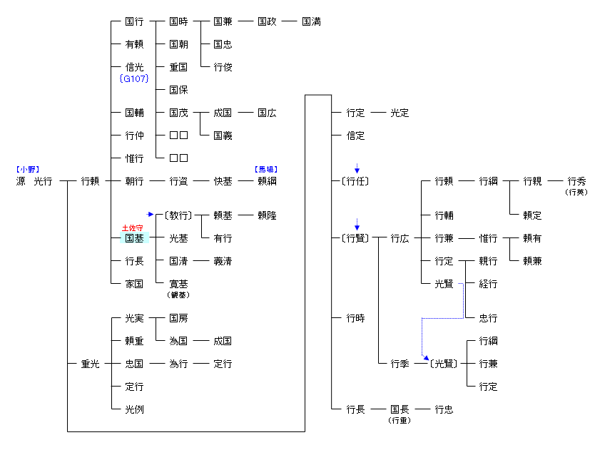 | G107:源 実国 | 源 経基 ― 源 頼光 ― 源 実国 ― 源 光行 | G108:源 光行 | ● |