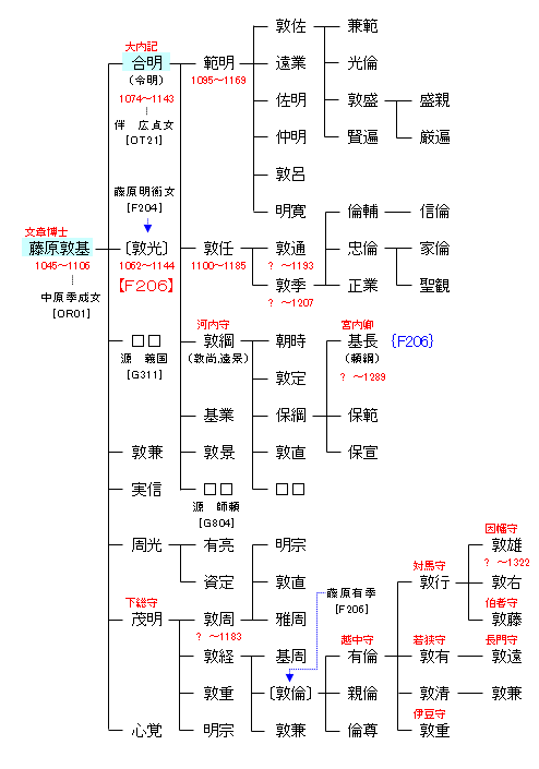 | F204:藤原蔵下麻呂 | 藤原鎌足 ― 藤原宇合 ― 藤原蔵下麻呂 ― 藤原敦基 | F205:藤原敦基 |