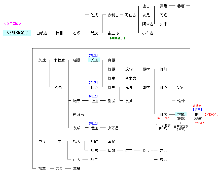 | 『先代旧事本紀』の「国造本紀」によれば、成務天皇の御代に物部氏の祖・伊香色雄命の3世孫の船瀬足尼(船瀬宿禰)が初代久自国造に任命されたという。船瀬足尼は舟瀬宿祢・舟瀬足尼とも表記する。また「船瀬足尼」は『先代旧事本紀』度会延佳神主校正鼇頭旧事紀・同書前田侯爵家所蔵安貞年間古写本による表記であり、同書神宮文庫本では「船瀬尼」と表記されている。 | 在道氏とも表記する。丈部長道・丈部氏道・丈部継道・丈部福道の4人が天長10年(833年)2月丙子に姓を有道宿禰と賜わった(『続日本後紀』)のにはじまる。 |