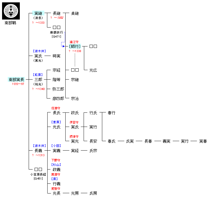 G471:南部光行  源 経基 ― 源 頼信 ― 源 義光 ― 源 義清 ― 南部光行 ― 南部実長 G476:南部実長
