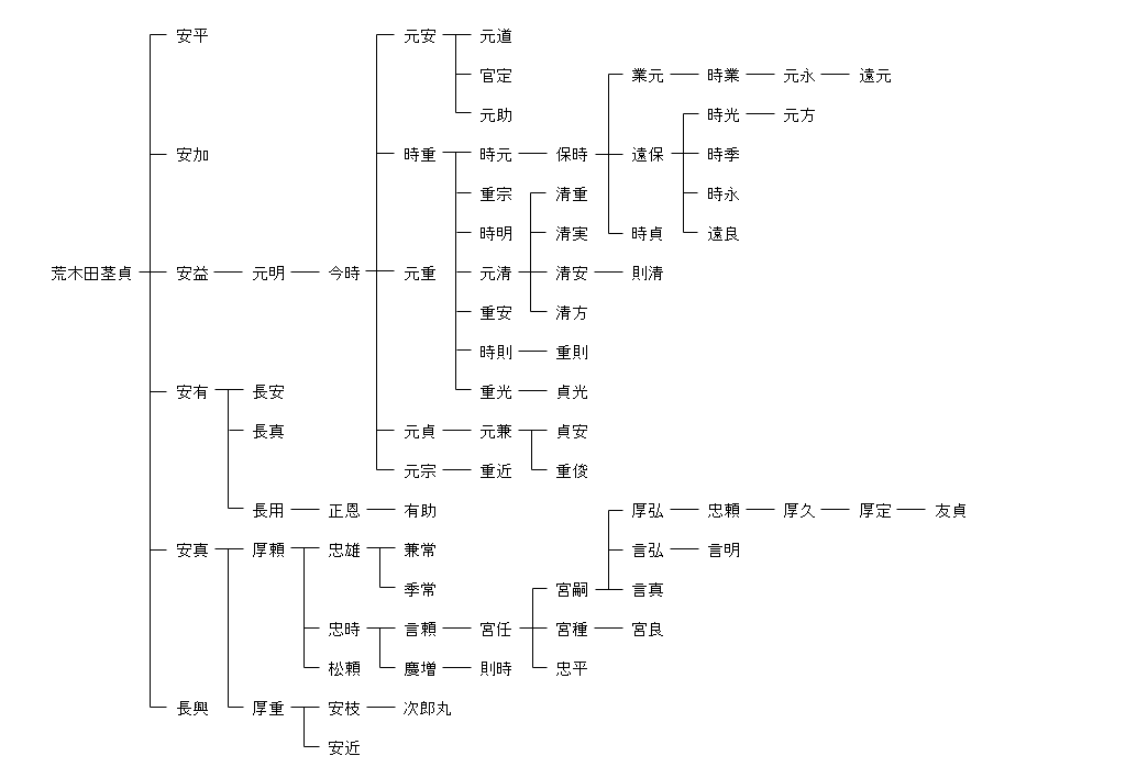 荒木田最上 ― 荒木田田長 ― 荒木田男公 ― 荒木田茎貞