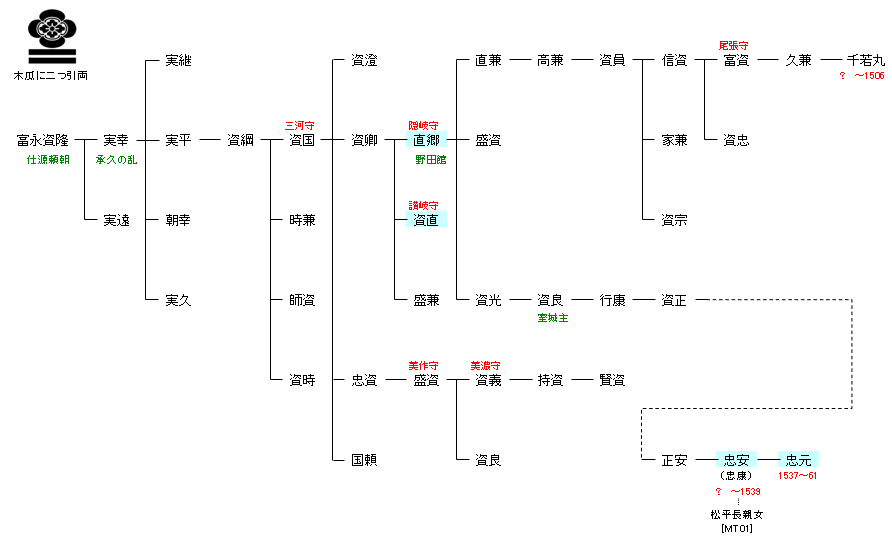 松平信定に追われた松平広忠に味方し、天文5年(1536年)9月10日、広忠を室城に迎え入れる。しかし、信定の軍勢に攻撃されたため、閏10月7日、室城を自焼し広忠は今橋へ移っている。 『西尾私史』によれば、永禄の頃、忠安は領地である設楽郡野田の館に住んでいたが、吉良氏没落後の永禄7年(1564年)3月に鵜ヶ池に移り住み、永禄9年(1566年)8月10日に没したという。一方、『岡崎領主古記』(岩瀬文庫蔵)によれば、天文8年(1539年)、吉良持広は織田氏と結び今川義元と断交した。これに対し、持広の弟・荒川義広は、義元に味方し、今川軍を居城である荒川城に入れたため、城近くの荒川山付近で度々合戦となった。そして8月2日の合戦で、持広と忠安は揃って戦死したという。富永氏の墓がある大通院の過去帳にも、富永一族が同日荒川山で戦死したことが記されている。 |