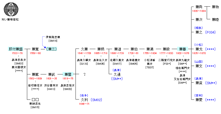 | OT21:肝付兼俊 | 大伴武日 ― 大伴 咋 ― 大伴安麻呂 ― 肝付兼俊 ― 肝付兼盛 | OT22:肝付兼盛 | ● |