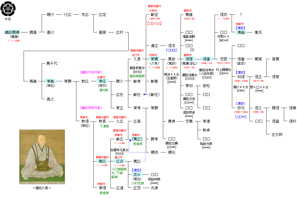織田氏の祖とされる。初め越前丹生郡織田庄の地頭で、『織田家譜』によると、越前守護であった管領・斯波義教(義重)にその才能を見いだされて登用され、尾張に派遣された。のちに故郷の織田庄から取り、苗字を織田と名乗った。また常昌と尾張守護代となる織田伊勢守入道常松は同一人物とも。子とされる常勝は斯波家家老となったという。 |