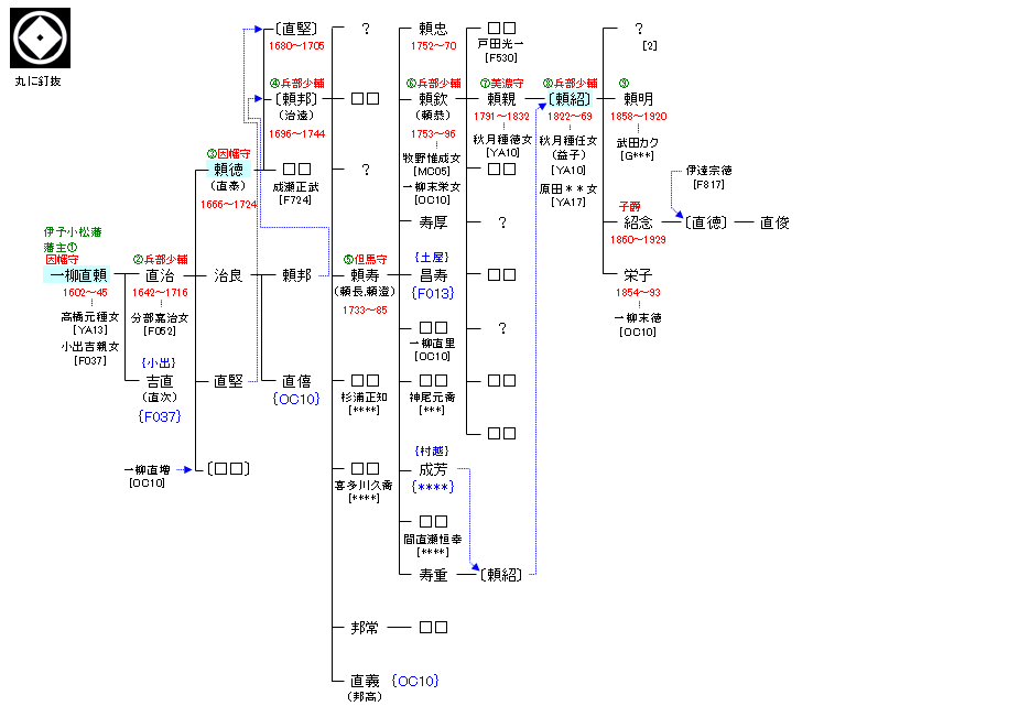 | OC10:一柳宣高 | 物部大新河 ― 越智益躬 ― 河野為時 ― 河野親経 ― 河野通久 ― 一柳宣高 ― 一柳直頼 | OC11:一柳直頼 | ● |