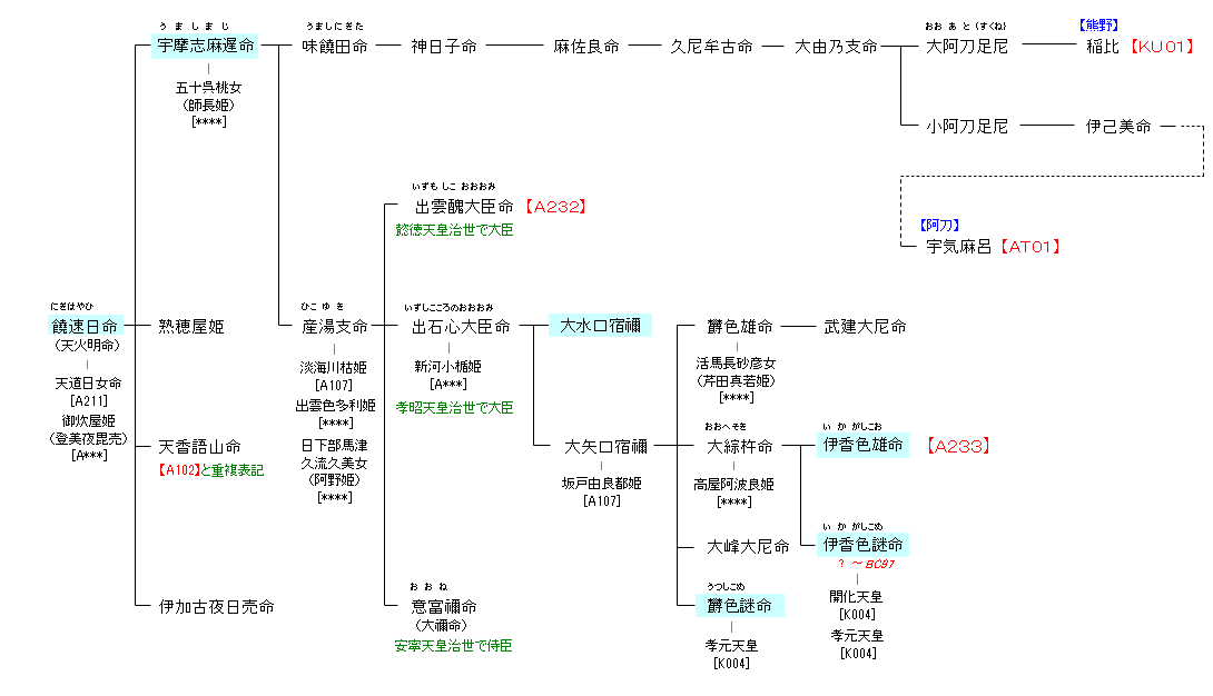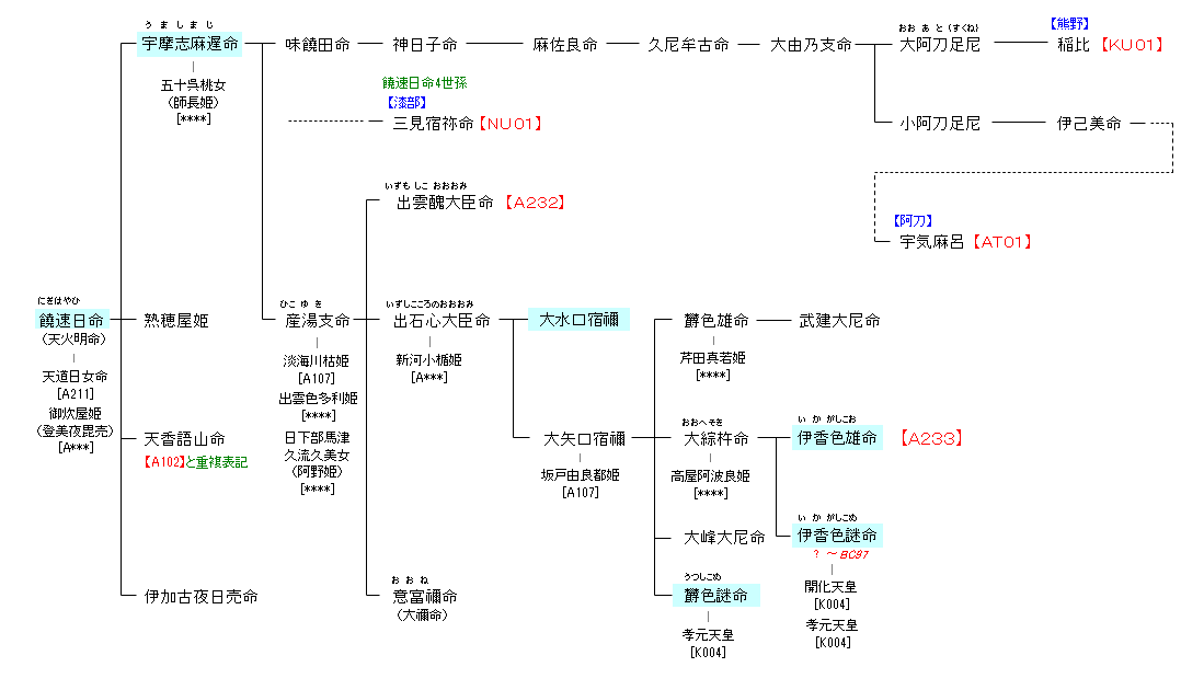 | A101:天照大御神 | 天照大御神 ― 饒速日命 | A231:饒速日命 |