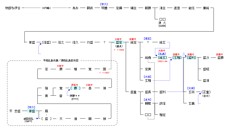宇久氏は桓武平氏の子孫とする『平姓五島系譜』と、清和源氏武田氏流とする『源姓五島家系図』の二つが伝えられている。桓武平氏説は、平忠盛の四男家盛を祖とするものである。家盛は清盛の弟にあたる人物で、久安六年(1150)に京都を去って行方不明となり、平家が壇の浦で滅亡したのちの文治三年(1187)に宇久島に移ってきたという。 |