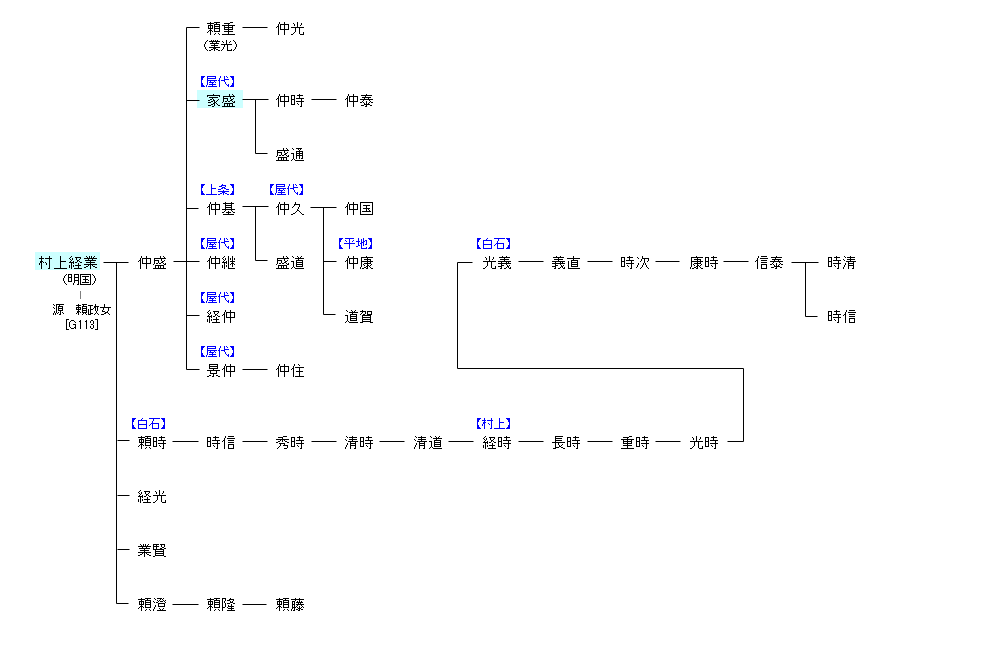 | G504:村上為国 | 源 経基 ― 源 頼信 ― 村上頼清 ― 村上為国 ― 村上経業 | G509:村上経業 | ● |