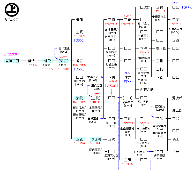 | G506:屋代満照 | 源 経基 ― 源 頼信 ― 村上頼清 ― 村上為国 ― 村上安信 ― 屋代満照 ― 室賀宗国 | G507:室賀宗国 |