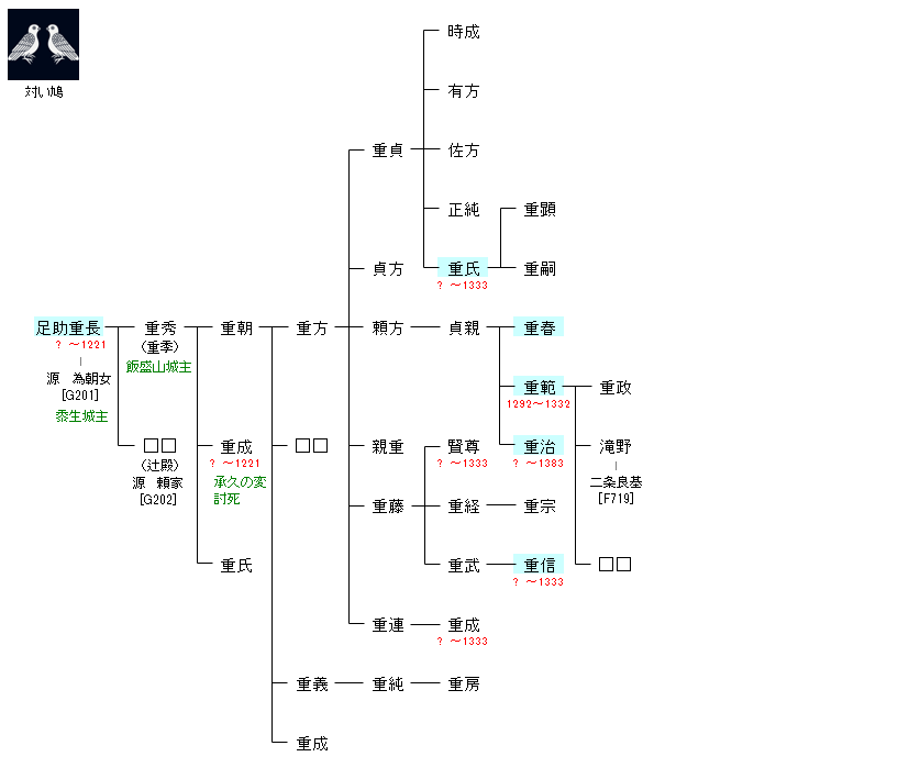 | G603:浦野重遠 | 源 経基 ― 源 満政 ― 八島重実 ― 浦野重遠 ― 山田重満 ― 足助重長 | G605:足助重長 | ● |