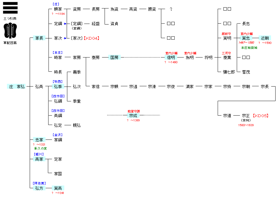| KD02:児玉弘行 | 大部豊日 ― 大部船瀬足尼 ― 児玉惟行 ― 児玉弘行 ― 庄 家弘 | KD03:庄 家弘 |