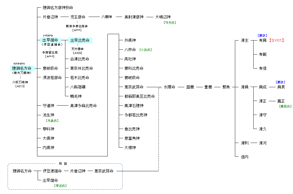 | 建御名方命 | 出早雄命 | 出早比売命 |