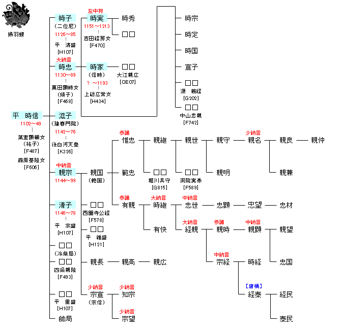官位は正二位・権大納言で平大納言,平関白と称された。平家滅亡後も生き延びている。「平家にあらずんば人にあらず」とはこの時忠の発言である。 久安2年(1146年)3月、17歳で非蔵人、翌年正月に六位蔵人となる。久安4年(1148年)から翌年にかけて検非違使・左衛門少尉となる。 平治の乱が終わり清盛の発言力が著しく高まった永暦元年(1160年)4月、時忠は検非違使,右衛門権佐に抜擢された。翌年正月には清盛が検非違使別当に就任して京都の治安維持の責任者となり、時忠は清盛の下で現場の指揮に当たった。 この頃から時忠は清盛の思惑から外れ、独自の動きを見せるようになる。応保2年(1162年)6月、院近臣・源資賢が二条天皇を賀茂社で呪詛したとして解官されるが、時忠も陰謀に関わったとして23日に出雲国に配流された。この事件において清盛は二条天皇支持の立場をとり、時忠に手を差し伸べることはなかった。 永万元年(1165年)7月に二条天皇が崩御すると、非蔵人から蔵人頭にまでなるなど極めて異例の累進をして、仁安2年(1167年)2月11日には参議,右兵衛督となり、召還されてわずか2年余りで公卿への昇進を果たした。 仁安3年(1168年)2月に憲仁親王が践祚(高倉天皇)、3月には妹・滋子が皇太后となる。時忠も滋子の兄という立場から、後白河院の側近として活動することになる。 その後、平家の繁栄とともに昇進していくが、清盛がなくなり、後白河法皇の影響力が強まる中で、平家滅亡への道を転がり落ちていく。 寿永2年(1183年)正月、時忠は権大納言となるが政権の崩壊は間近に迫っていた。寿永2年(1183年)5月、平氏の北陸追討軍が木曾義仲に撃破され(倶利伽羅峠の戦い)、今まで維持されてきた軍事バランスは完全に崩壊した。平宗盛は、安徳天皇と二宮だけを連れて都を退去した。時忠は閑院内裏に向かい、内侍所(神鏡)を取り出してから都落ちに同行した。安徳天皇および平氏に付き従った貴族は、わずかに時忠,時実,信基,藤原尹明に過ぎなかった。 元暦元年(1184年)2月7日、平氏は一ノ谷の戦いで大敗。平氏はこの敗戦の打撃からついに立ち直れず、翌元暦2年(1185年)3月24日、壇ノ浦の戦いで壊滅した。 時忠は壇ノ浦で捕虜となり、4月26日に入洛した。時忠は神鏡を守った功績により減刑を願い、娘を源義経に嫁がせることで庇護を得ようとした。5月20日、捕虜となった人々の罪科が決定し、時忠,時実,信基,藤原尹明,良弘,全真,忠快,能円,行命の9名が流罪となったが、時忠,時実は義経の庇護を受け都に残留していたため頼朝により咎められ、9月23日、時忠は情勢の悪化を悟り、配流先の能登国に赴いた。親平氏貴族の働きかけにより、時忠は配地では丁寧に遇されていたようである。また、都に残された時忠の家族にも特に圧迫が加えられた様子はない。文治5年(1189年)2月24日、時忠は能登国の配地で生涯を終えた。