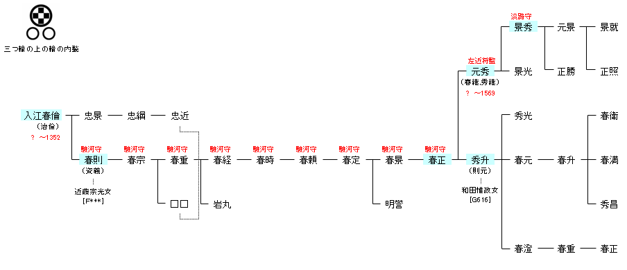 | F008:入江維清 | 藤原武智麻呂 ― 藤原乙麻呂 ― 藤原為憲 ― 入江維清 ― 入江春倫 | F009:入江春倫 | ● |