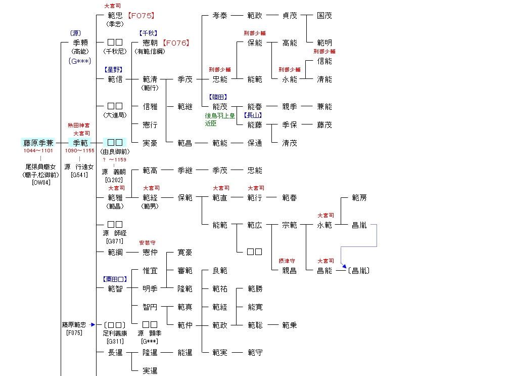 | F072:藤原永頼 | 藤原武智麻呂 ― 藤原巨勢麻呂 ― 藤原貞嗣 ― 藤原道明 ― 藤原永頼 ― 藤原季兼 | F074:藤原季兼 |