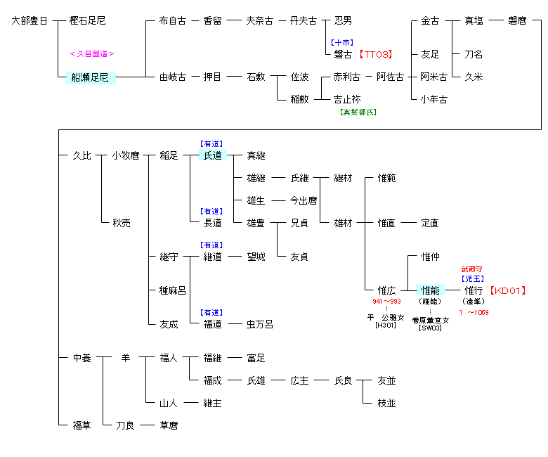 | 『先代旧事本紀』の「国造本紀」によれば、成務天皇の御代に物部氏の祖・伊香色雄命の3世孫の船瀬足尼(船瀬宿禰)が初代久自国造に任命されたという。船瀬足尼は舟瀬宿祢・舟瀬足尼とも表記する。また「船瀬足尼」は『先代旧事本紀』度会延佳神主校正鼇頭旧事紀・同書前田侯爵家所蔵安貞年間古写本による表記であり、同書神宮文庫本では「船瀬尼」と表記されている。 |